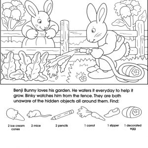 Find 2 ice cream cones, 2 mice, 2 pencils, 1 carrot, 1 slipper and 1 decorated egg.
