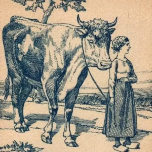 Life on the Farm: The Timeless Bond Between a Farmer and Her Ox In this charming vintage illustration, we see a young woman standing beside a sturdy…