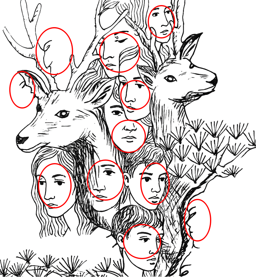 Here’s the real challenge—how sharp are your eyes? Hidden throughout the illustration are multiple faces, each blending seamlessly into the deer’s form and the forest backdrop.