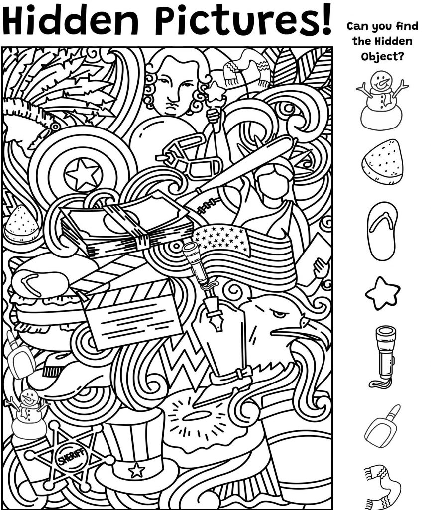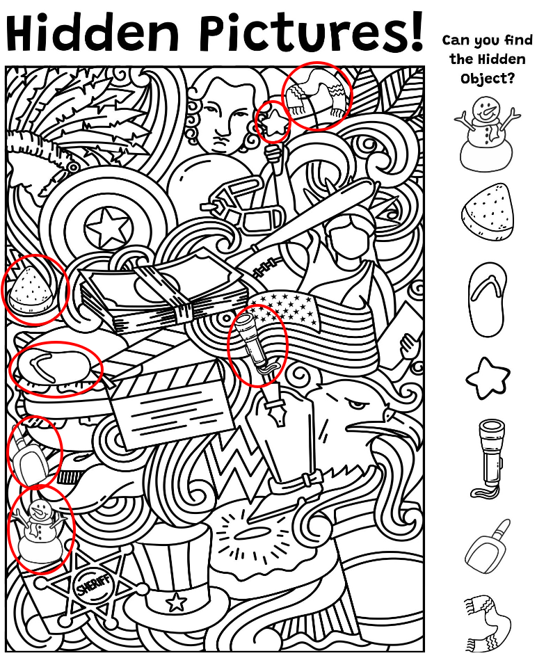 - Don’t forget to spot the slice of pie, the baseball gear, and the sheriff’s badge hidden among the swirls.