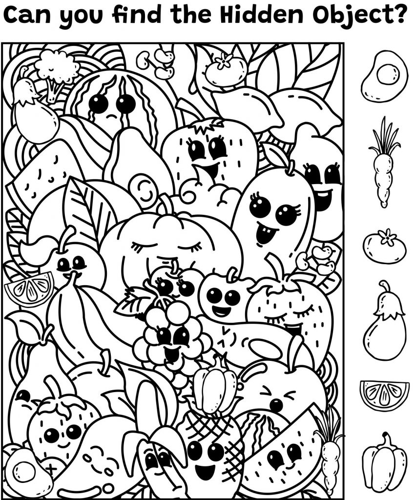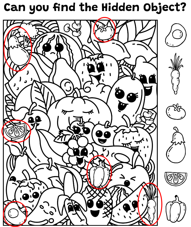 - Start with the edges. Hidden objects often lurk near borders or corners. Check the edges of fruits and leaves carefully.
