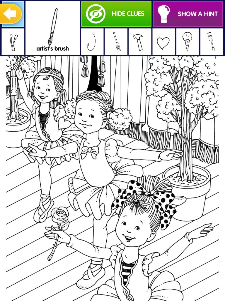 The image sets the stage with three young ballerinas dressed in frilly tutus, bows, and ballet slippers. They’re performing gracefully in front of drawn curtains, with decorative trees adding charm to the background. While the main focus is on the dancers’ elegance, the real fun lies in searching for cleverly hidden objects scattered throughout the picture.