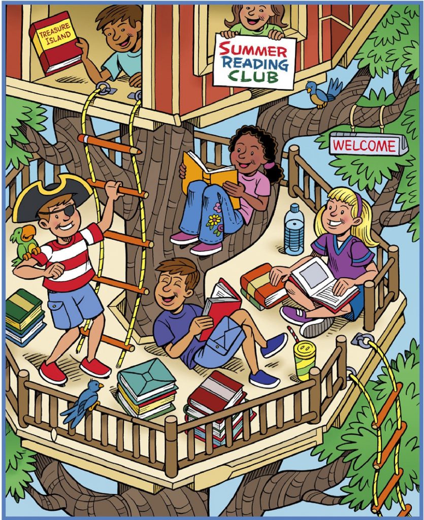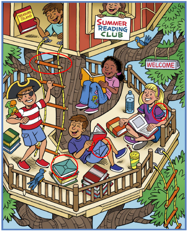At first glance, the image radiates pure summer fun. Sunlight filters through the branches as children gather in their treehouse library — a wooden haven where books and laughter intertwine. But look closer, and you’ll find more than just smiling faces and stacked novels. Hidden objects blend seamlessly into the scene: from a parrot perched on a shoulder to a Treasure Island book clutched in excitement, every detail tells its own story.