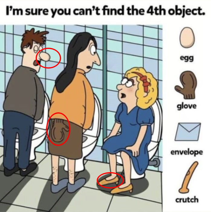 Finally, the crutch is the most noticeable object of all, but don’t let its prominence fool you. Its placement in the scene might be subtle, and it could easily blend with other objects around it. Look for any potential shape that’s slightly off, like something poking out from behind a character or hiding under a stall divider.