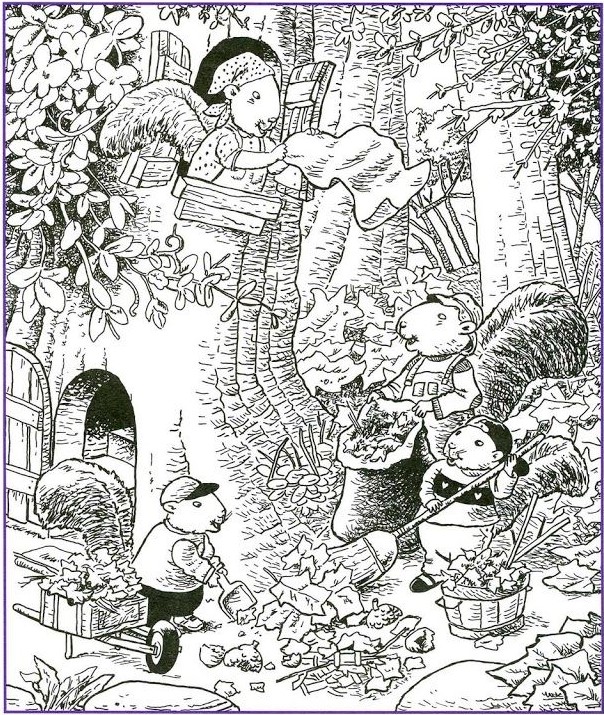 At the heart of this illustration, squirrels and small woodland creatures are hard at work. One climbs high into the tree, another sweeps leaves, while others gather piles into baskets and wheelbarrows. It’s a scene bursting with energy, cooperation, and detail. But if you look closely, you’ll see the real magic—hidden shapes and objects tucked among the leaves and branches.