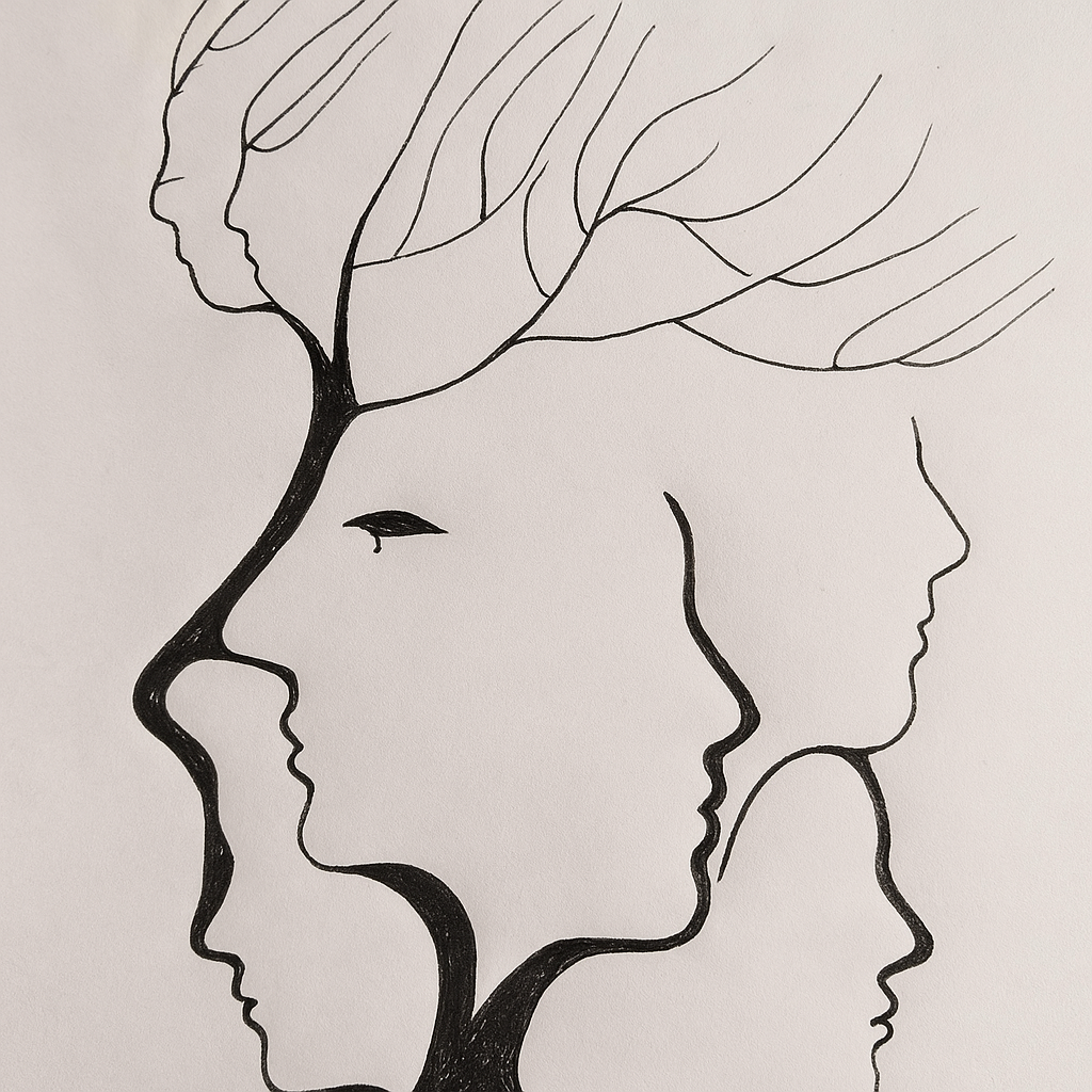 This drawing doesn’t just entertain the eyes—it speaks to the soul. The overlapping faces suggest layers of identity, memories, and experiences. Just as the lines overlap to form new faces, our lives are shaped by the people we meet and the choices we make. The branches remind us of growth, resilience, and connection, while the faces reflect the complexity of who we are. The artwork becomes a metaphor: we are not just one self, but many selves, built from the moments and relationships that define us.