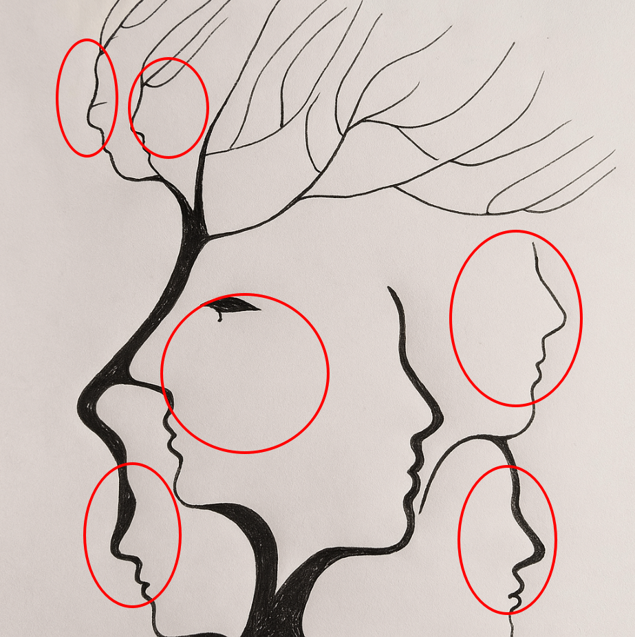 At first sight, this striking artwork looks like the profile of a single human face, outlined in bold black ink. But look again, and suddenly the image transforms into multiple faces, each blending seamlessly into the next. Some faces are large and commanding, while others are smaller, almost whispering from the curves of the lines. Above them, tree-like branches stretch outward, turning the illustration into a fusion of humanity and nature. This is not just a drawing—it’s a puzzle for the mind and a mirror for the imagination.