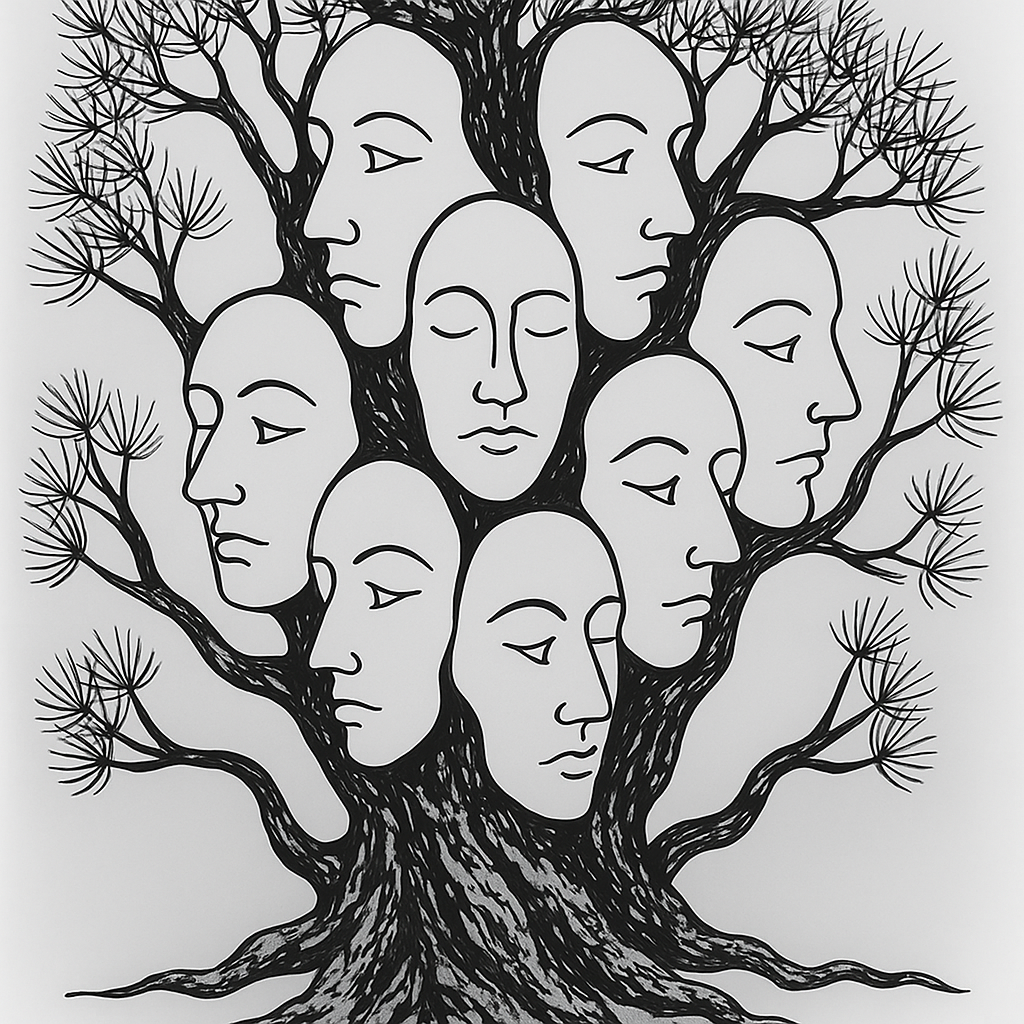 By merging human faces with the tree’s structure, the artist suggests that humanity and nature are inseparable. Each face could represent a generation, a memory, or a soul connected through time. The trunk symbolizes strength and unity, while the branches — spreading in all directions — represent individuality, diversity, and the flow of life.