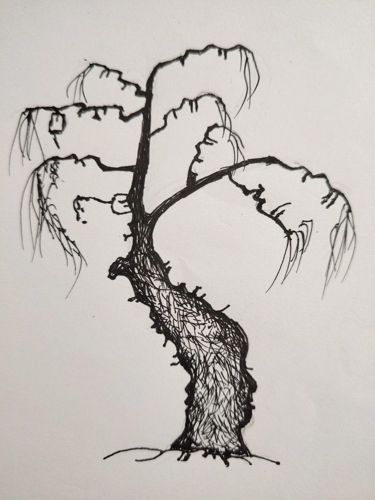 Why does that matter? Because it strips away distractions. You’re left with raw emotion and stark contrast. The thick, jagged lines of the trunk create tension and weight. The soft, hanging tendrils that form the “hair” of the faces suggest fragility and flow.
