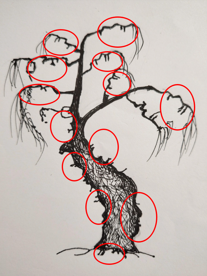 The tree’s canopy is formed by the outlines of human faces—each one unique, each one silently observing. Some look calm, others pained, and a few seem lost in contemplation. It’s like the tree is a collection of souls, memories, or perhaps whispers of time gone by.