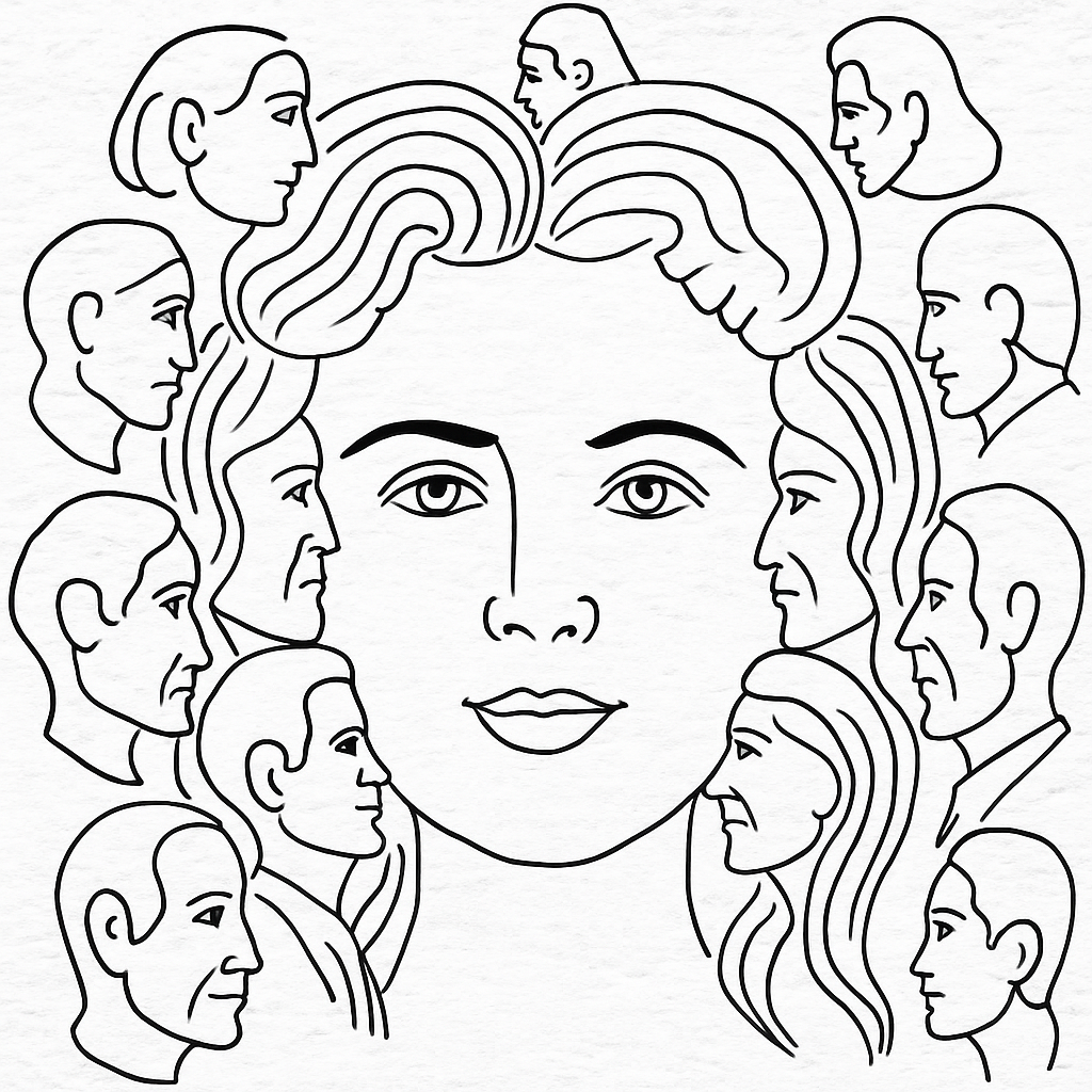 When you first see this image, your eyes naturally focus on the central figure: the large woman’s face. Her symmetry and bold features dominate the page, making it easy to assume she’s the main subject. But if you let your gaze wander, you’ll start noticing something strange. Her hair, her jawline, and even the space around her aren’t just decorative lines—they’re outlines of smaller faces hidden in plain sight.