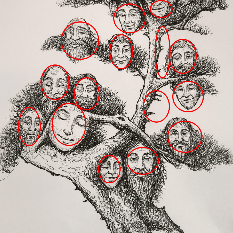What makes this drawing captivating is that it doesn’t just trick the eye—it tells a story. Each face seems to carry its own emotion. Some smile gently, others look wise and contemplative, while a few seem almost hidden in shadows. It’s as if the tree is home to generations of souls, each one leaving its mark in the wood. The picture isn’t just art—it’s a conversation between nature and humanity, captured in ink.