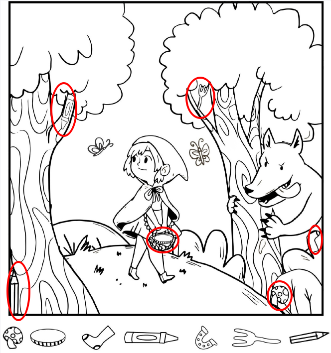 1. Start with the obvious. Identify main elements like Little Red, the wolf, and the trees before focusing on smaller items.