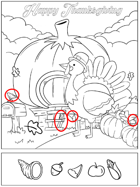 - Focus on repeating patterns. Feathers, leaves, and pumpkins all repeat in this picture. Something that breaks the pattern is likely a clue.
