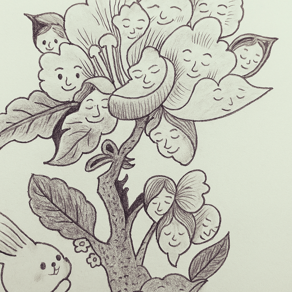 The smiling faces on the petals evoke the idea that every part of nature has a soul — that trees, flowers, and even the wind carry emotions and wisdom. The drawing feels almost enchanted, as if the flower is sharing its joy with the world.
