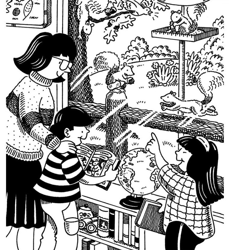 The scene is warm and familiar. The family stands indoors, with books and a globe close at hand, turning their learning moment into something hands-on. Through the window, squirrels scurry across branches, leap to feeders, and playfully explore the garden. It’s a reminder of how much wonder can be found in the everyday—no need to travel far when nature often comes right to your backyard.