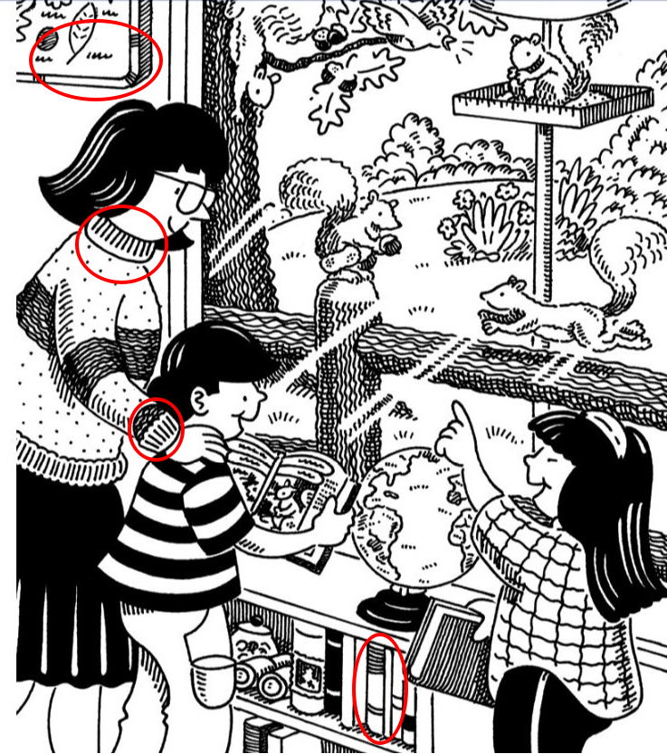 - Check for repetition. Anything that breaks a repeated pattern—like leaves or tree bark—could be a hidden clue.