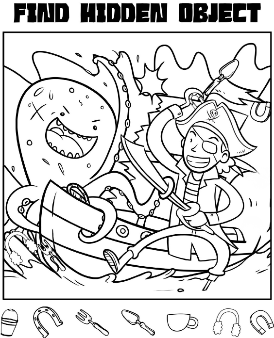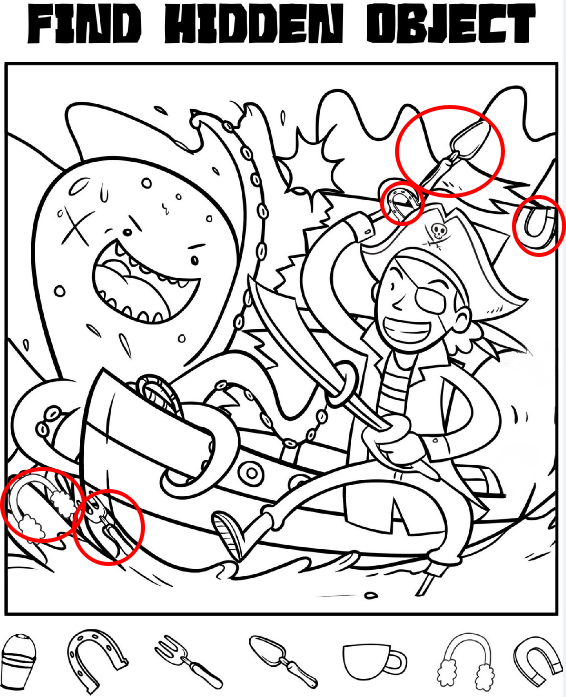 - Start with the big shapes. Focus on the pirate, the monster, and the boat—many hidden objects are camouflaged in their outlines.