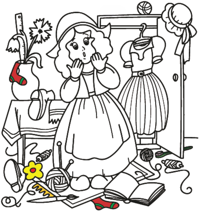 Before you start scanning, take a second to absorb the whole picture. In the center, a surprised girl stands amid a whirlwind of craft supplies and wardrobe pieces: