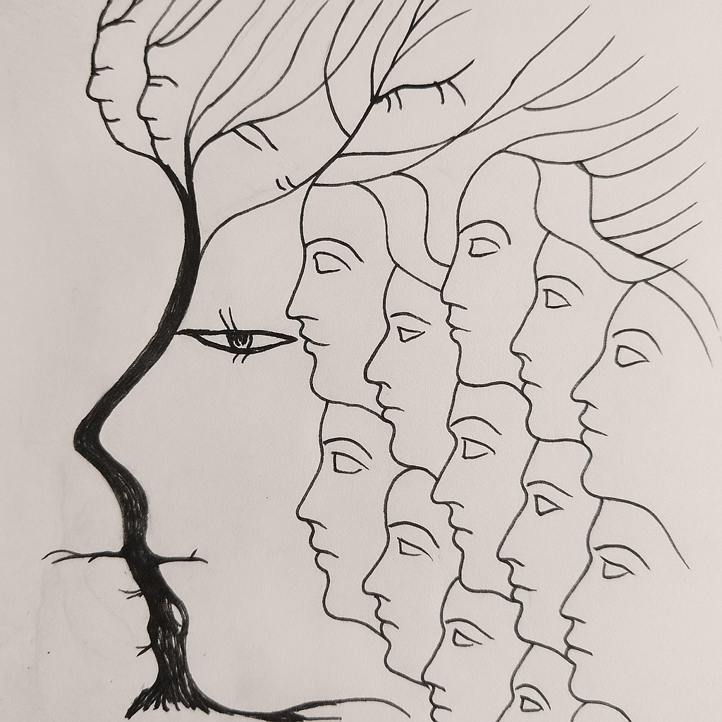 This particular image can be seen as more than just art—it’s also symbolic. The large face might represent identity or individuality, while the many smaller faces could stand for different versions of ourselves, the people who influence us, or even the hidden layers of the human mind. The tree-like lines at the top add another dimension, suggesting growth, connection, or wisdom branching out over time. Isn’t it fascinating how a simple sketch can spark such deep reflections?
