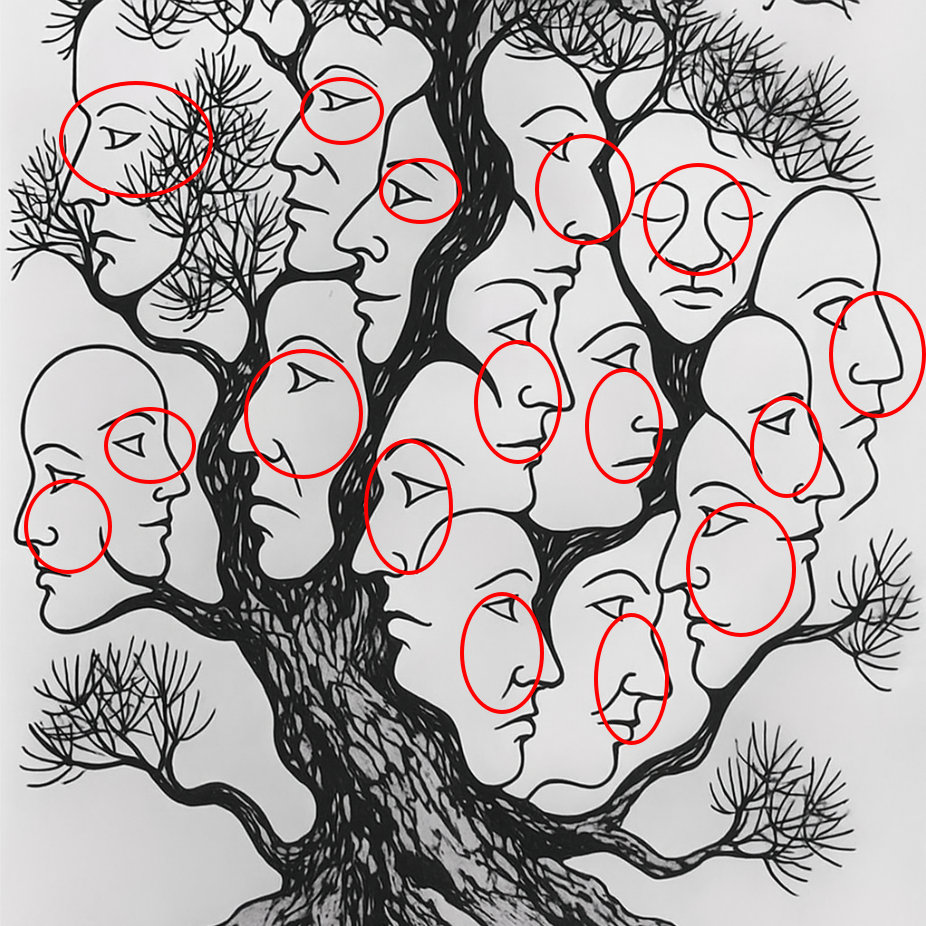 At first, your eyes register a tree with strong roots and branches spreading upward. The branches twist like veins, stretching outward to the sky. The bark looks rugged, full of texture. But after a moment, you begin to notice something odd. Outlines that should be bark instead resemble noses, foreheads, and lips. Suddenly, the tree is alive with human presence. What once seemed ordinary has become extraordinary.