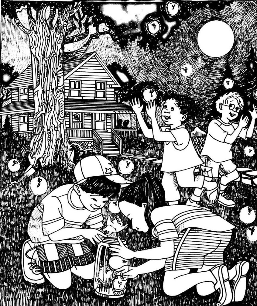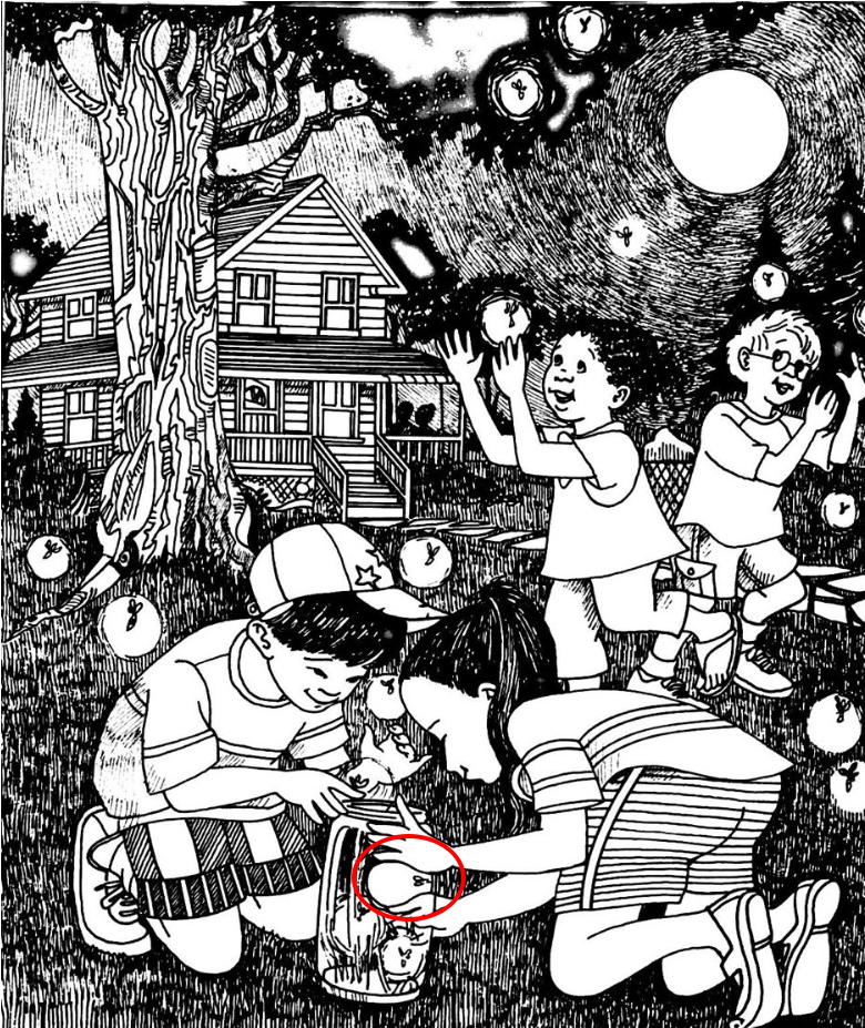Hidden object puzzles tied to childhood scenes like this remind us that discovery is everywhere. Just as the kids find wonder in glowing insects, we find joy in spotting the tiny, carefully hidden shapes scattered across the drawing.