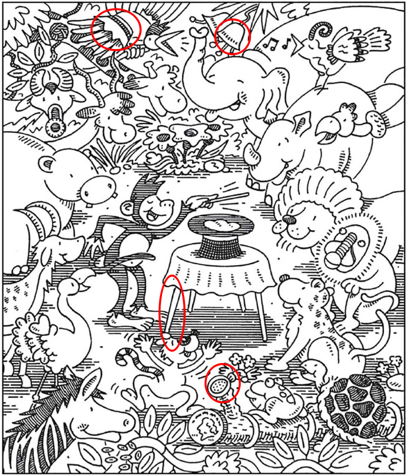 - Objects blending into patterns—a flute tucked into the zebra’s stripes, or a face disguised in the leaves.