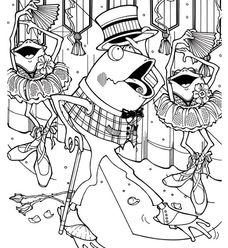 Right away, the picture makes you smile. A well-dressed frog in a checkered vest, top hat, and bow tie stands at center stage, looking like a confident performer. On either side, ballerina frogs twirl in tutus, holding decorative fans as if they’re in the middle of a ballet routine. The stage is decorated with tassels and streamers, while petals scatter across the floor. It’s a playful mix of nature and theater—frogs turned into elegant stars of the spotlight.