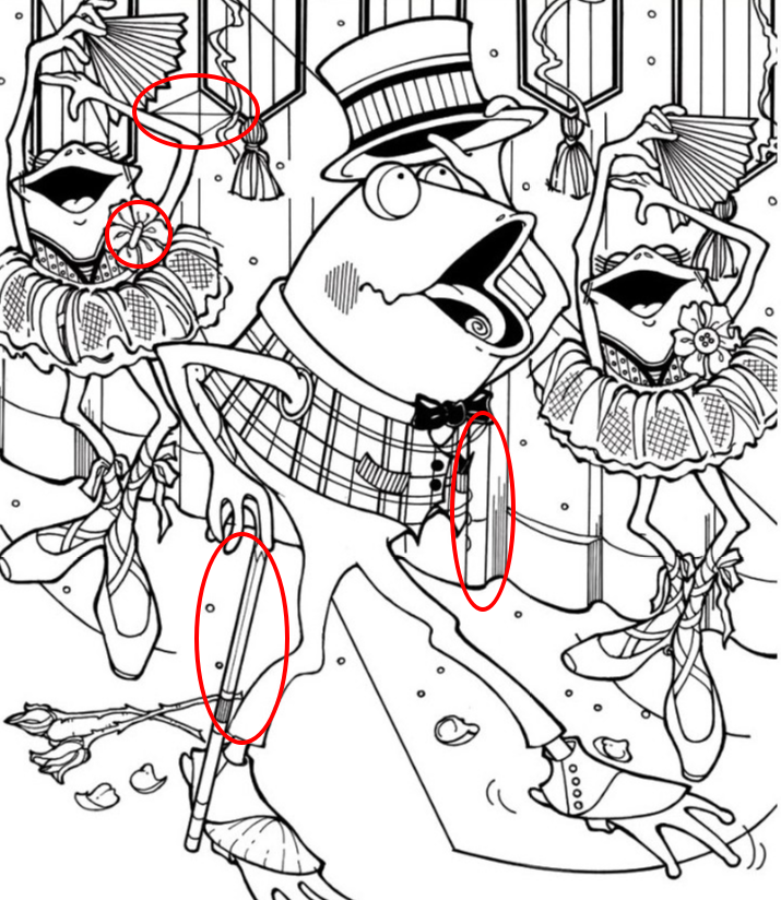 • The Costumes: The frogs’ vests, tutus, and accessories could contain unusual shapes or objects that don’t quite belong.