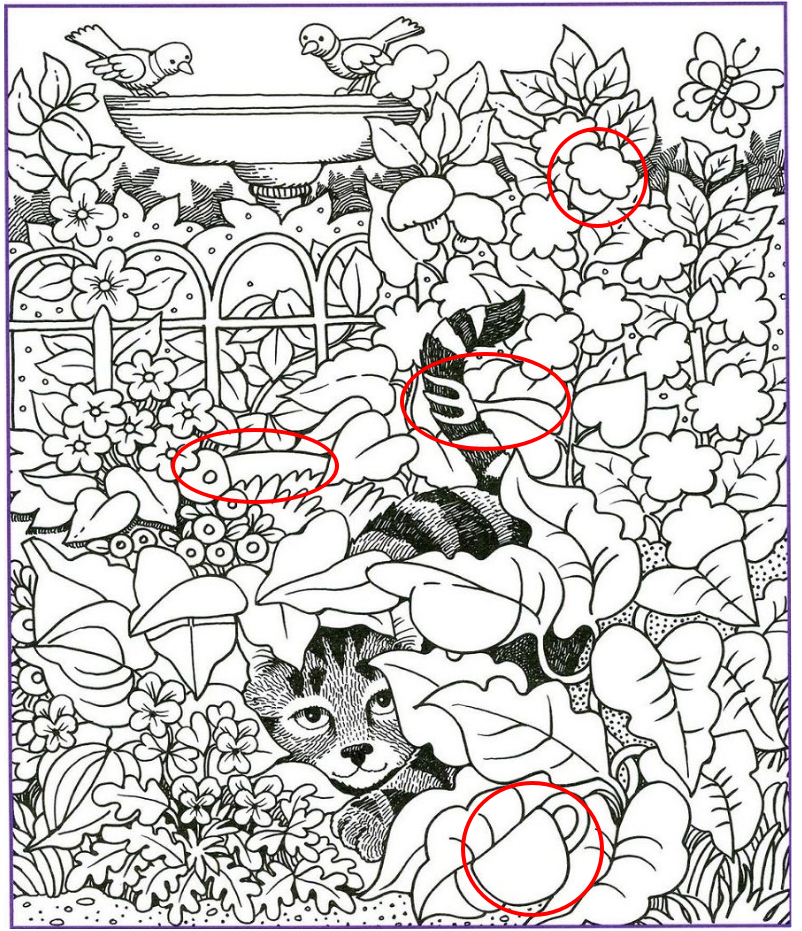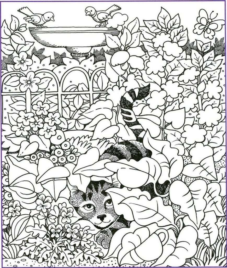 This garden illustration is more than just a drawing—it’s a reminder that beauty often hides in plain sight. The cat, nestled among the leaves, transforms the scene into a playful puzzle that engages both the eyes and the mind. The birds, flowers, and butterfly add layers of charm, but it’s the hidden surprise that makes the picture truly unforgettable.