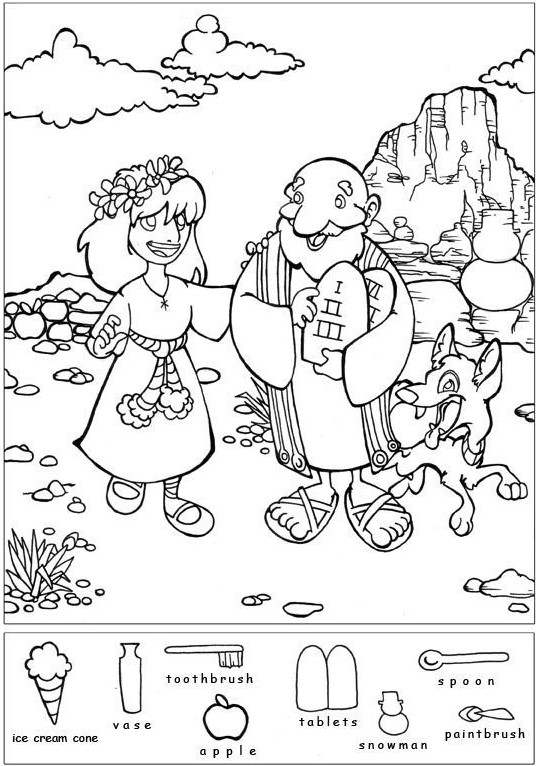 The man’s presence with stone tablets immediately evokes imagery from the Ten Commandments—a cornerstone of biblical teaching. The girl and the dog balance the scene by adding warmth and approachability, making it relatable for children and families who might use this artwork in faith-based learning or activities.