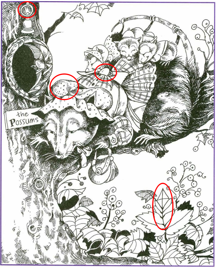 A sign reading “The Possums” hangs nearby, marking their home in the hollow tree. Surrounding them are leaves, berries, and vines—drawn with intricate detail that invites you to pause and admire the textures. But look closely, and you’ll notice that the scene isn’t as simple as it first appears. Hidden within the forest setting are cleverly disguised objects, each blending seamlessly into the environment.