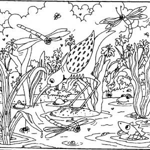 On the forest floor, look for a friendly snake weaving through a carpet of ferns. Nearby, a spotted mushroom—its cap dotted with white circles—pops out behind a cluster of grass.