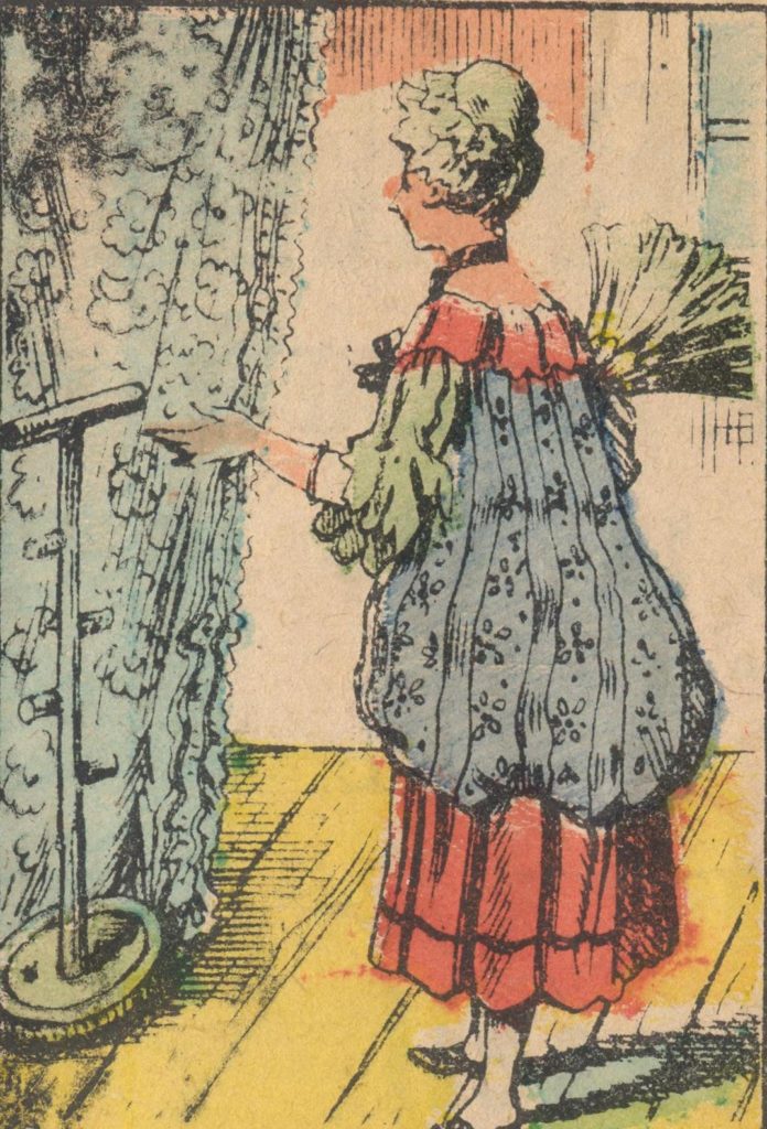 This illustration brings that to life. Her loose, puffed sleeves. The bunch of herbs or perhaps dried lavender in her hand. The wooden floor beneath her. Every detail speaks to a time when craftsmanship mattered, when even the mundane was infused with meaning.